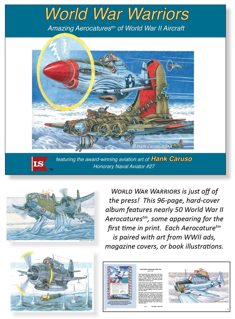 This isn't your ordinary aviation history book. Featuring the award-winning Aerocatures of renowned aviation artist Hank Caruso, this book presents a unique combination of humor, history, and attitude. Hank's personality-driven artistry blends technical accuracy, mission substance, and aviator character in a way that is quite different from "conventional" aviation art. This book contains a one-of-a-kind collection of nearly 50 World War II-inspired Aerocatures, featuring many well-known—and some obscure—aircraft of the era. The Aerocatures in this collection are accompanied by an equally unique assortment of archival art from World War II. These illustrations were sourced from aviation ads, magazine covers, and kids' books. They provide a fascinating caricature of America's spirit and focus during the war years. Aviation buffs, curious youngsters, and anyone who ever felt their heart race at the sights and sounds of an air show will find this book fascinating and rewarding. It's a unique gift for friends and relatives—or for yourself! Hardcover, 8.5"x11", 96 pp. ISBN 978-1-940169-16-3 |